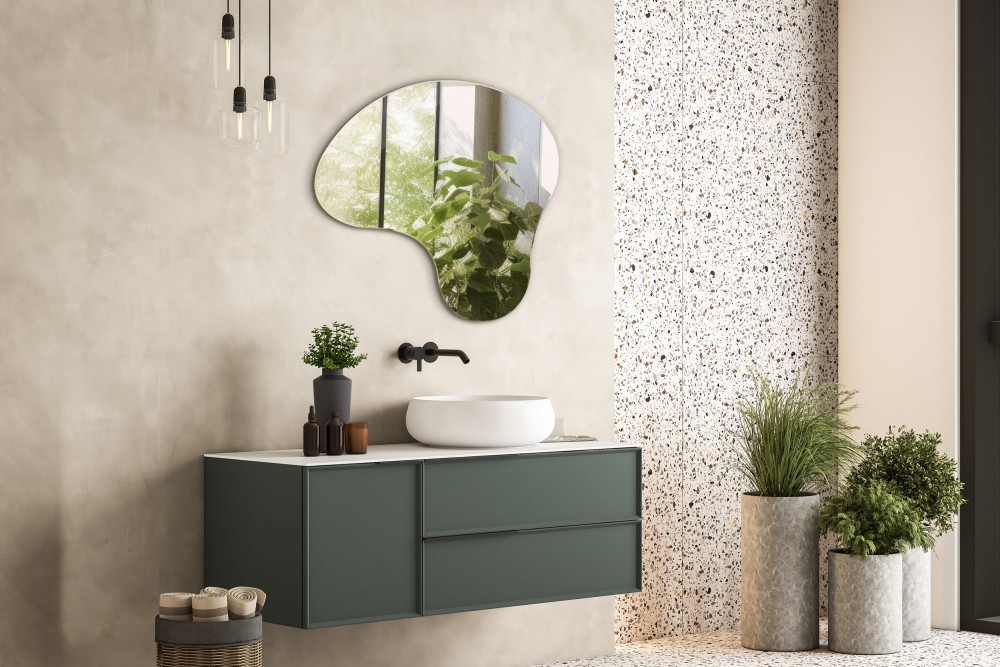 Si buscas un efecto audaz, el espejo del baño también puede tener una forma inusual, como asimétrica u orgánica, lo que puede dar al espacio un carácter único y de diseño.