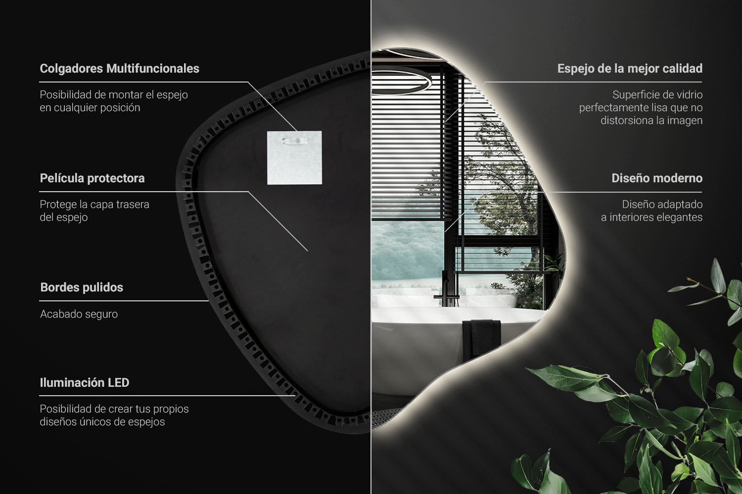 Dale vida a tu interior con un acento único que atraerá de inmediato todas las miradas. con iluminación LED única Espejo mancha es una decoración moderna que destaca por su forma inusual. Su forma única aporta frescura y carácter artístico a cualquier espacio. Es un elemento que se convertirá fácilmente en el punto focal de cualquier habitación: desde el salón, hasta el dormitorio y el baño elegante.